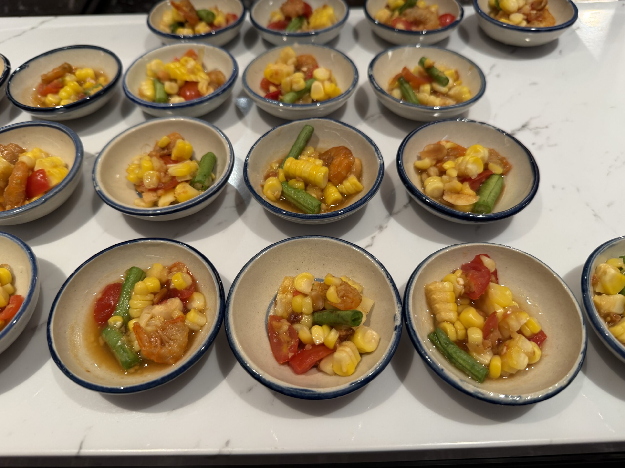 On the hot and savoury side, you’ll find rotating Thai and Western canapés – think corn salad in small bowls, duck crostini, and other tapas-style bites – plus house wines, beer, and basic mixed drinks.