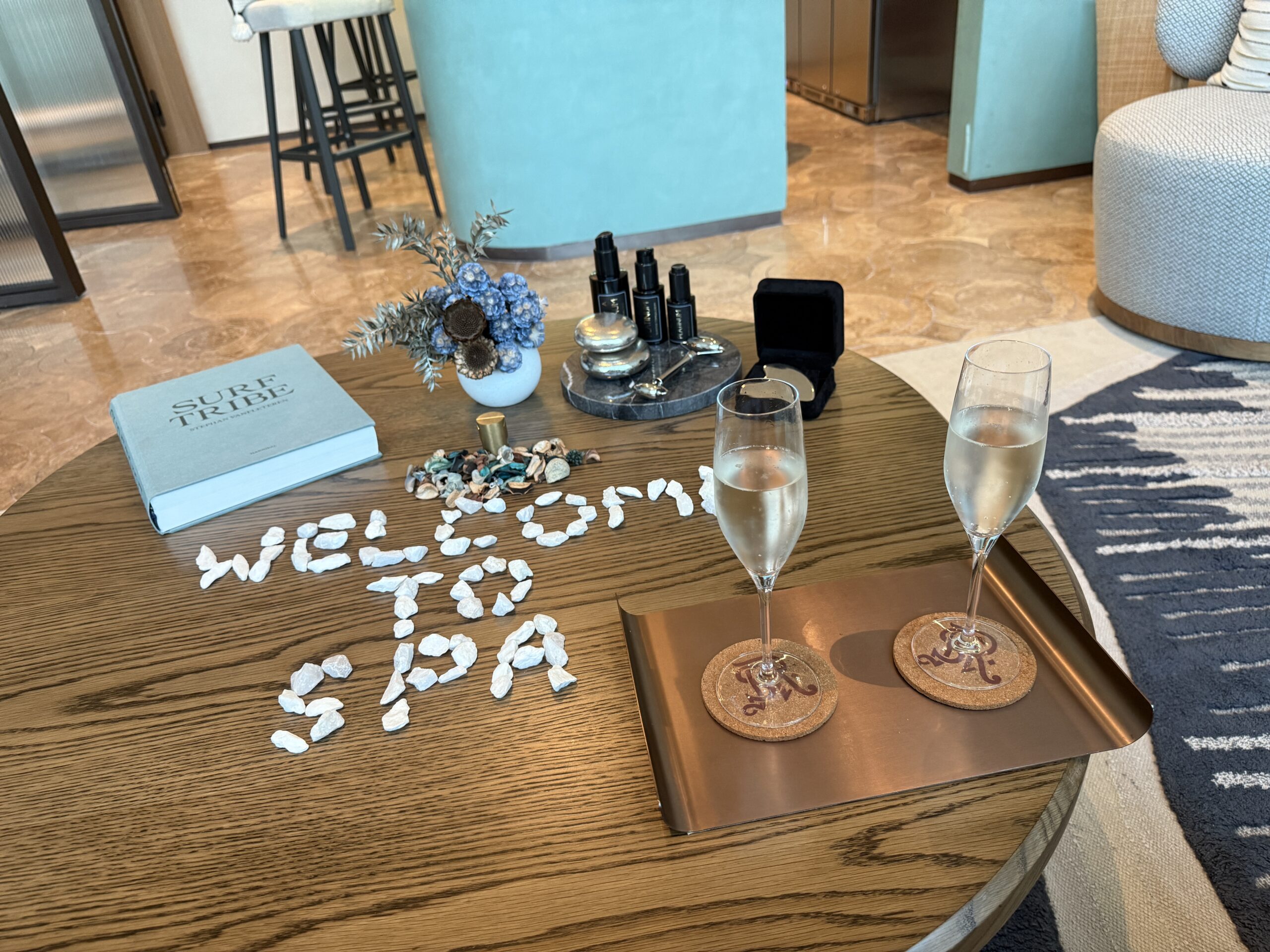 Managerial staff greeted us at the island pier with cool towels and welcome drinks, creating an immediate sense of hospitality. Our butler introduced herself and guided us through a brief island orientation en route to the Arrival Pavilion.