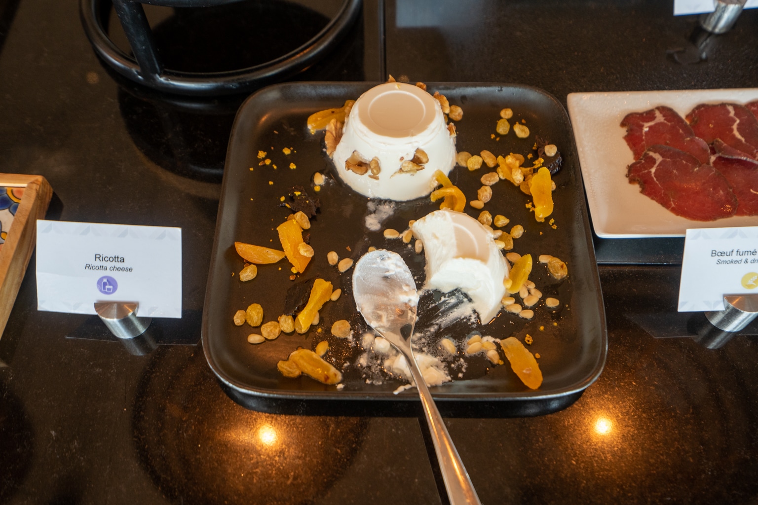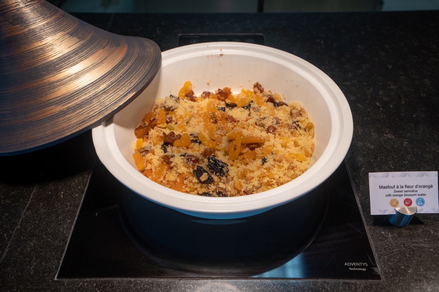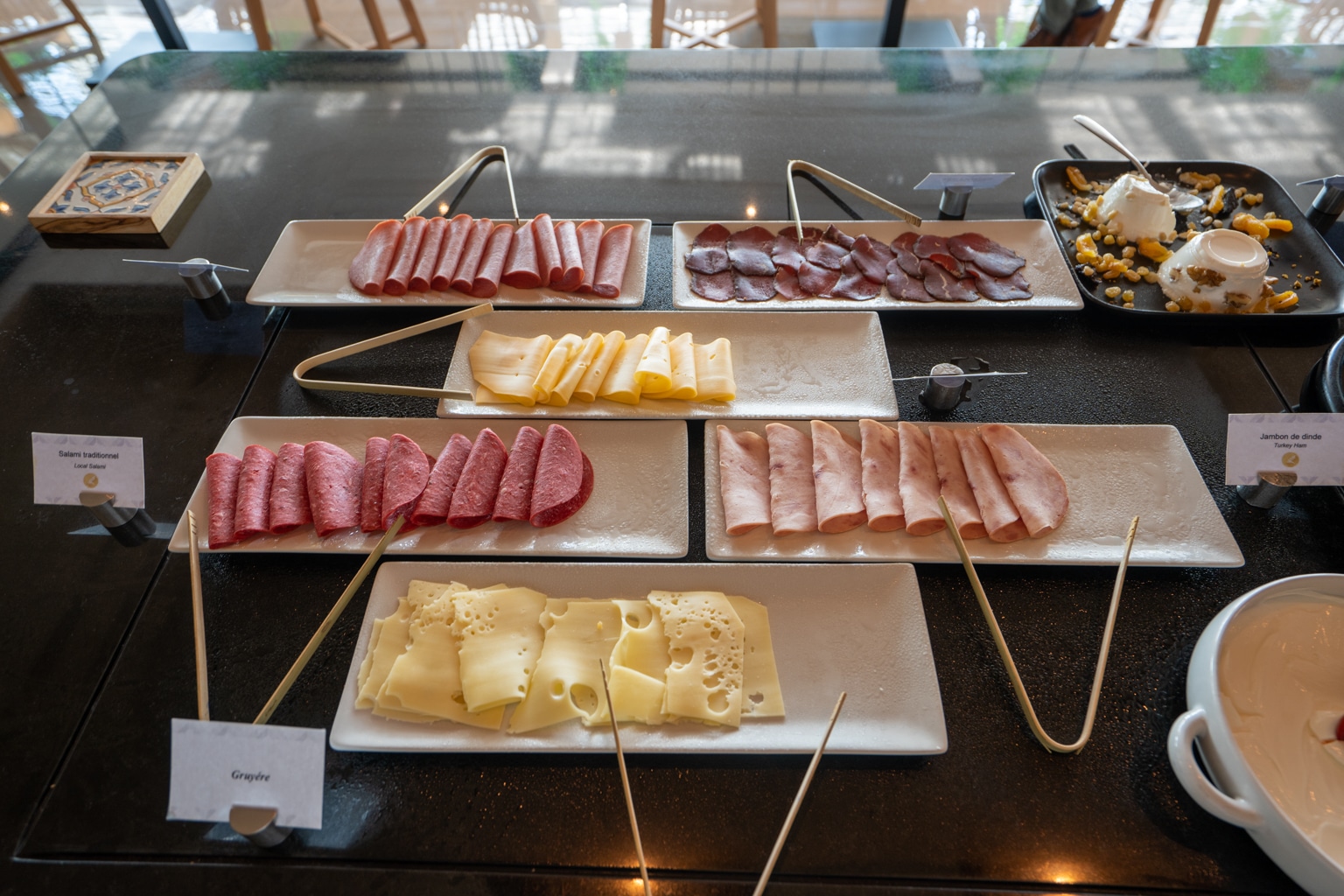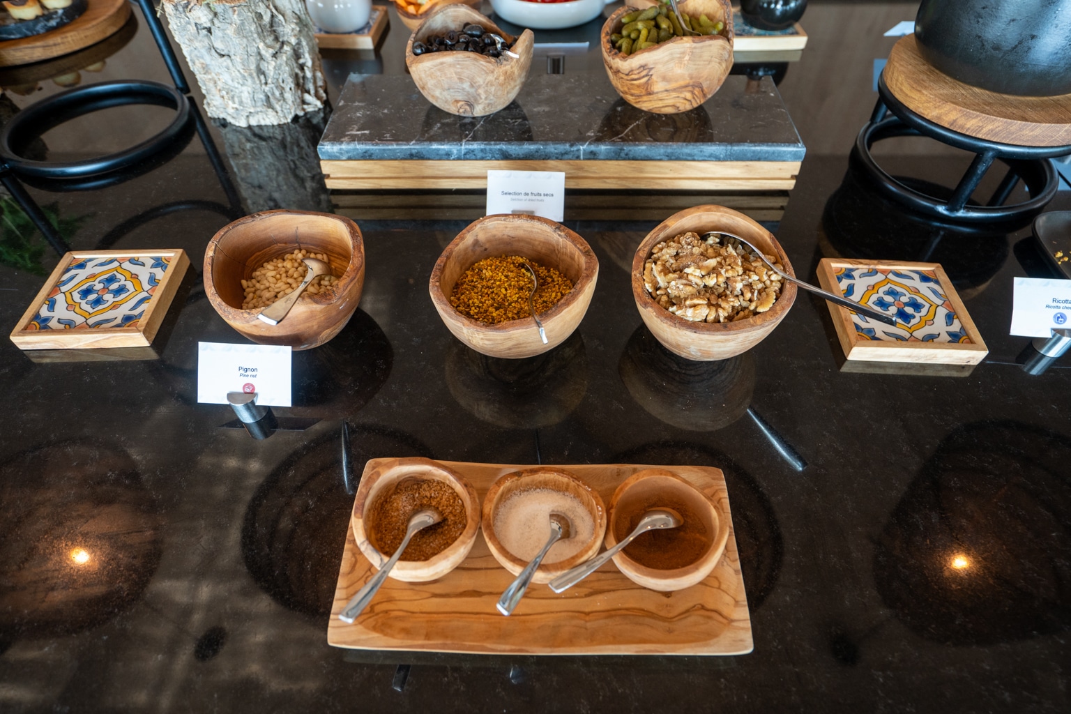A selection of some traditional items was also available, including Tunisian masfouf. Furthermore, there were also a series of dried fruits, granola, and cereals, as well as the usual fruit, pastries, bread, and cold charcuterie.