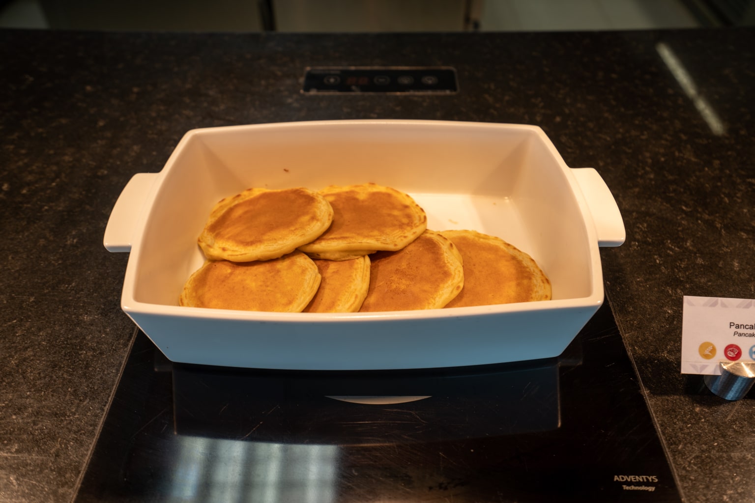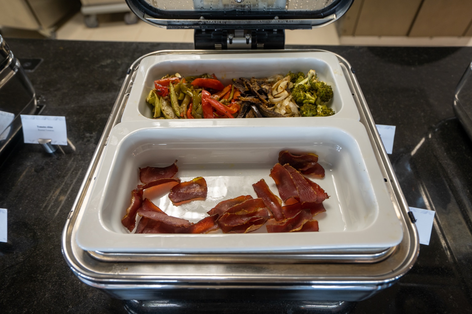 The spread was a fairly plain affair for a Marriott-branded hotel. Food was provided buffet-style with a mix of hot items available, such as pancakes, scrambled eggs, sausage, and bacon.